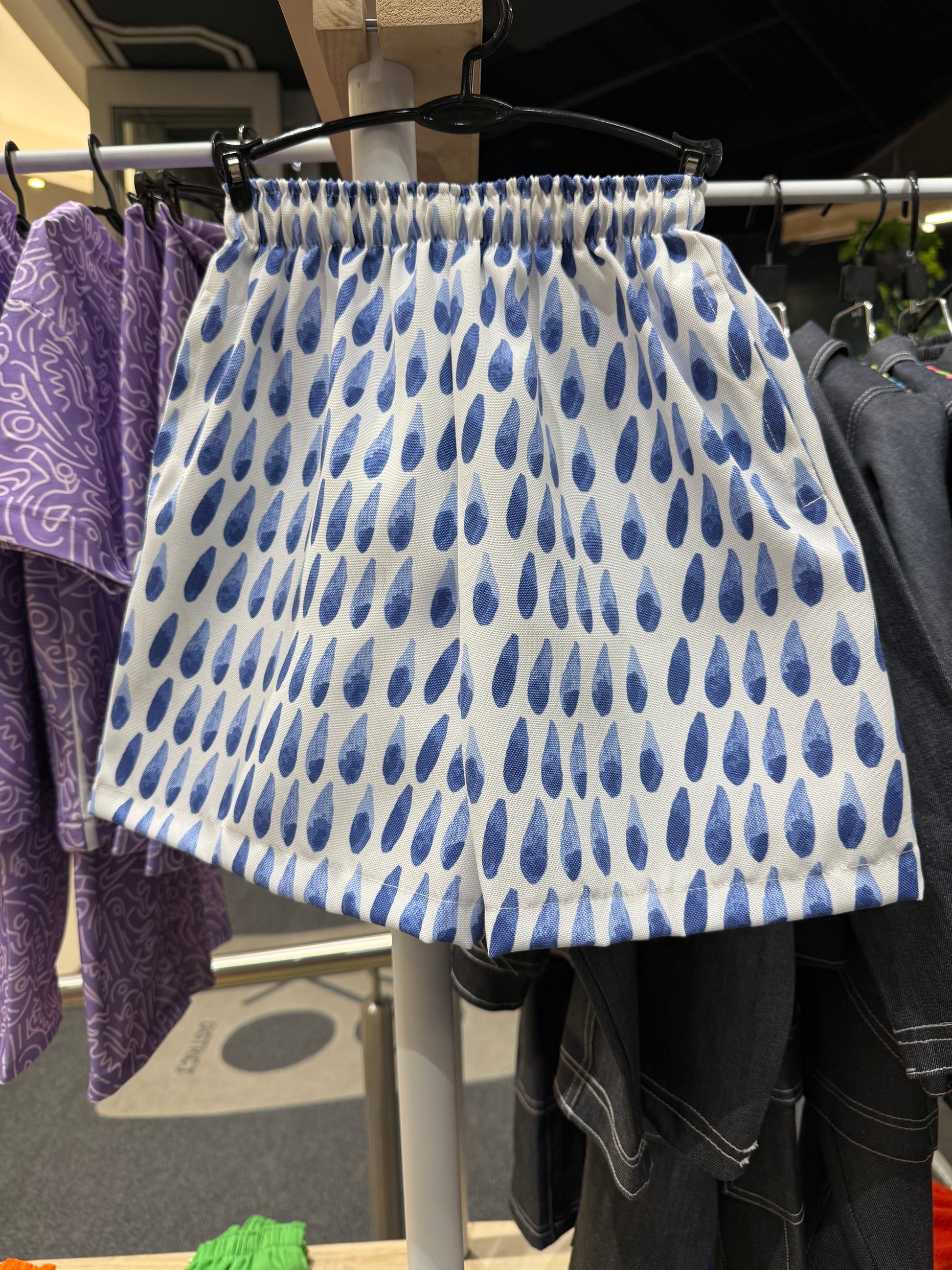 Keep it cool and comfy with these lightweight kids’ shorts featuring a fun blue raindrop print.